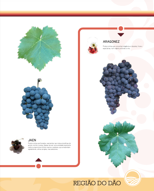 Na região do Dão, o Jaen é cultivado pelo menos desde os meados do século passado, sendo citado, nos inquéritos vitícolas de 1865, como das castas dominantes no concelho de Mangualde. É lícito pensar que tenha sido trazida por peregrinos regressados à pátria através dos caminhos de Santiago. Depois da praga da filoxera, difundiu-se por toda a região do Dão, graças à sua boa produtividade e prematuridade, que permitiam a produção de vinhos de boa graduação e boa cor. O cacho, nesta casta, é de tamanho grande e compacto, com bagos médios, uniformes e arredondados, epiderme pouco espessa negra-azul e média pruína. A polpa é mole e suculenta, não sendo corada. Os vinhos a que dá origem são elegantes, com teor alcoólico regular, intensos de cor e muito macios, dada a sua fraca acidez. É, no entanto, o seu perfume intenso e delicado, lembrando um pouco a framboesa, que torna esta casta preciosa. (Fonte: CVRD)
